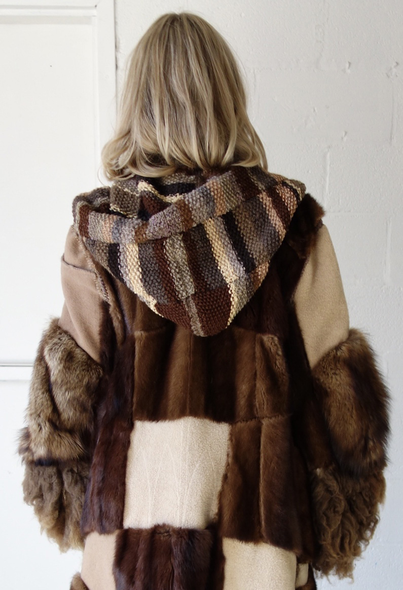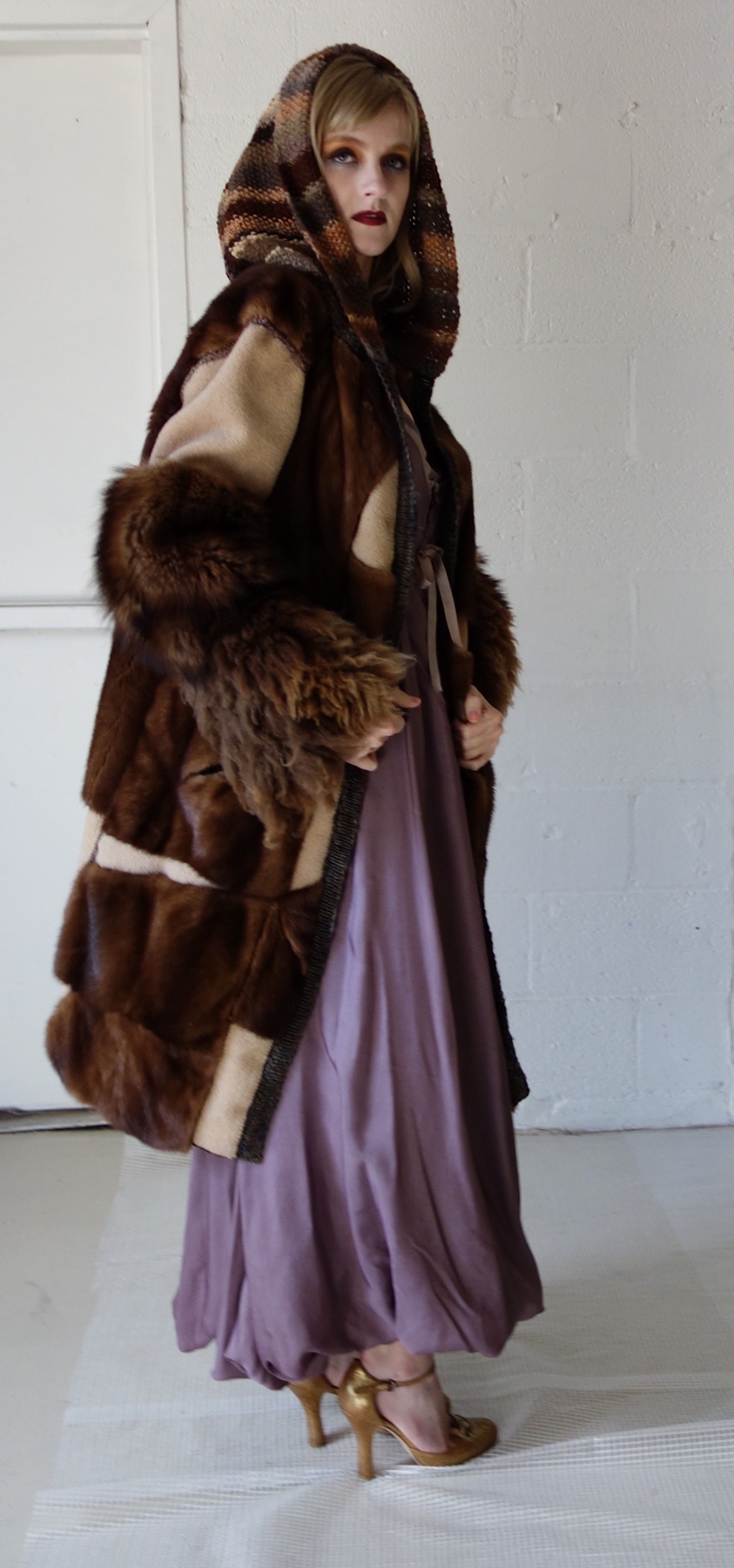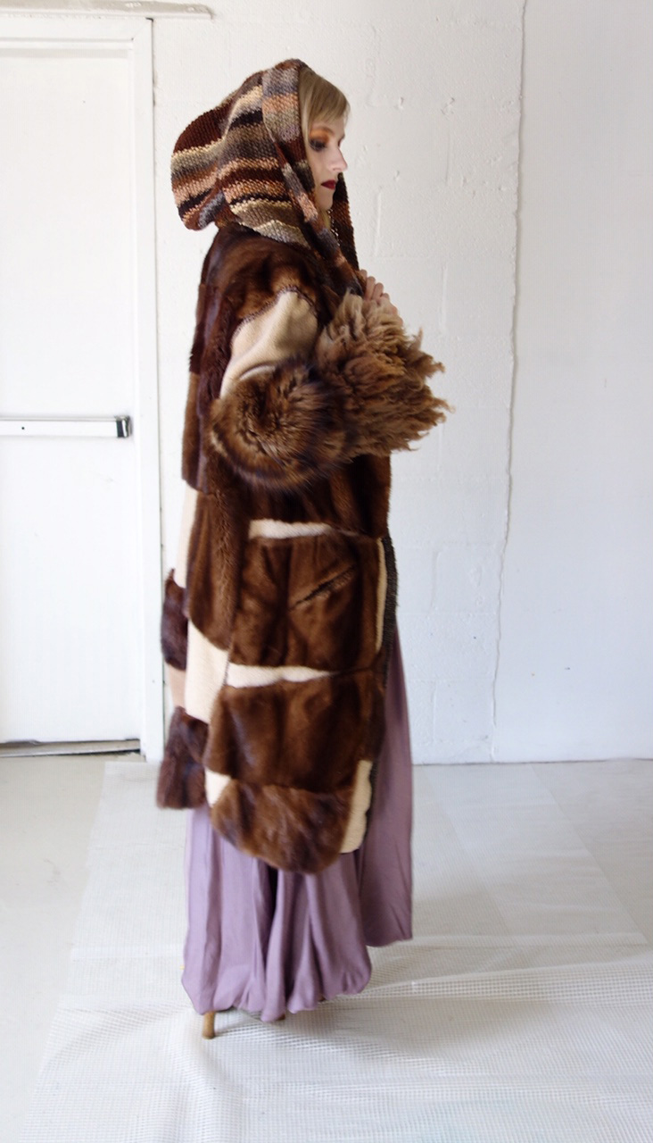 In 2018, another e-mail resulted from the September issue of Wag Magazine. Sonia had a Fendi mink from the 1980’s that was in terrible condition. I advised her against a redesign and a save. She insisted, so I mentioned that it would be necessary to cut it up into many pieces and create something wild. I combined her salvaged pieces of mink with sable, lamb, fox and boiled wool coating. I designed the hood, which was knit according to a sketch. It resulted in a flipping fur design using the pieces from the Fendi. It is also reversible.