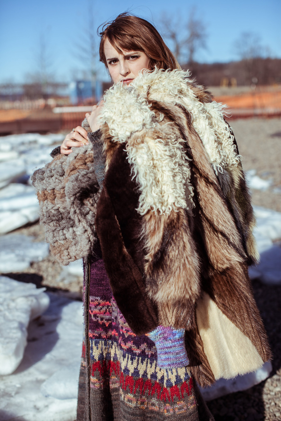 Naomi presented me with two furs that were in very poor condition. I had a considerable amount of scraps left from recent commissions. This was to be a puzzle coat and a freedom of design coat. The hood is crocheted alpaca roving. The cuffs are knit with alpaca. The alpaca was acquired from a local farm. The coat is rustic, rich in character and reversible.