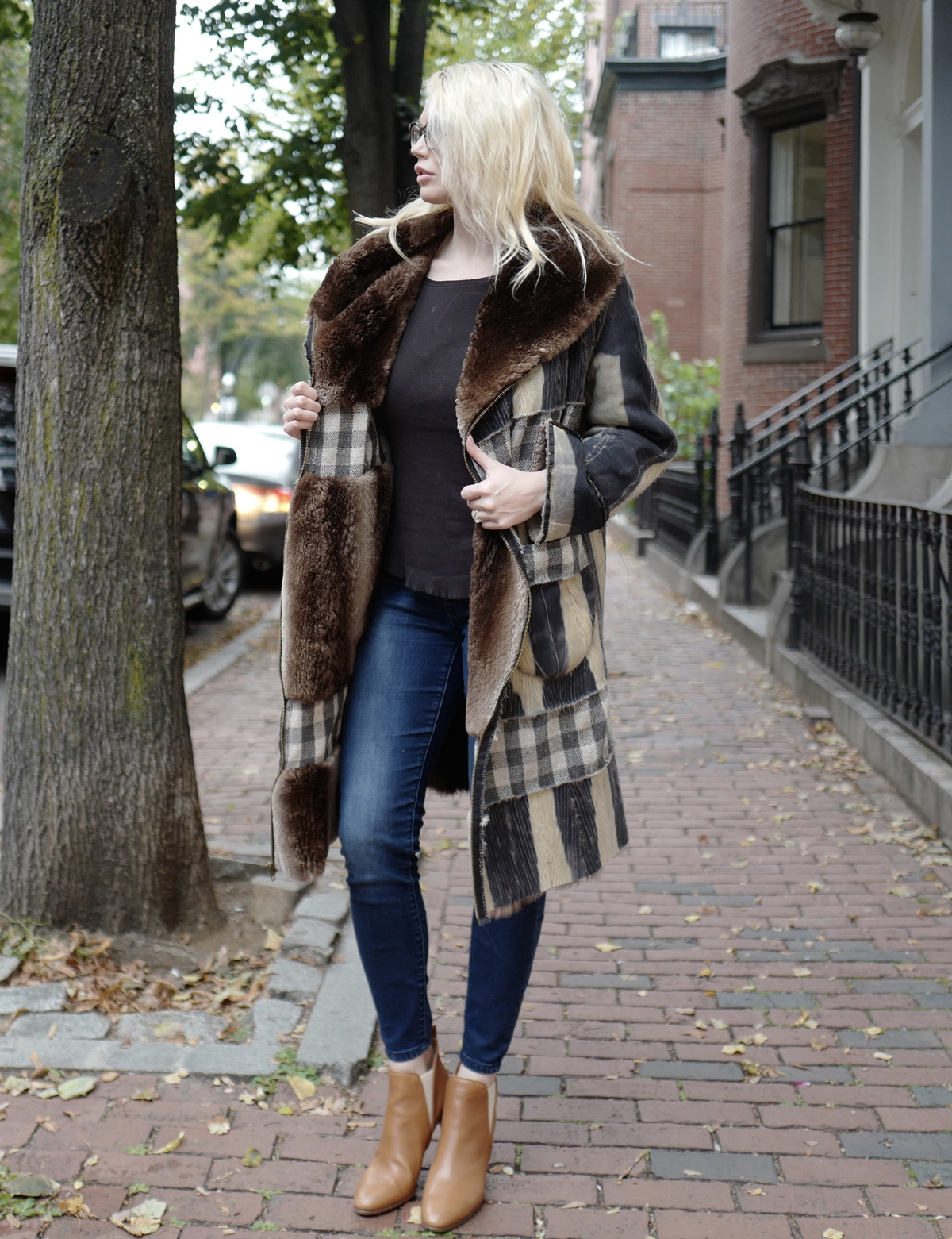 This was one of my favorite design transformations. Another Maine thrift shop find, sent to me by a friend. The signature inserted strips were hand-woven and made to order. I chose the yarn, the weave and the size of the strip to coordinate with the stripes made by the dye on the flip side of the fur. The pockets and zipper details made it a favorite piece. At my first pop-up, a man tried it on and bought it. Like many of my coats, they work well for anyone who fits the unique style of a particular Flipping Fur piece.