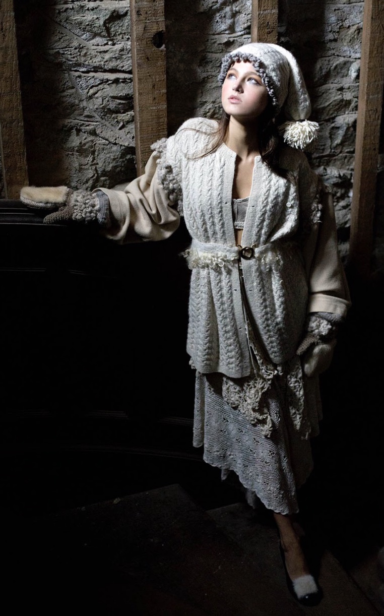 A deconstructed alpaca sweater and a pair of cashmere sleeves, from reworking a jacket, were combined to create a more interesting design. This further inspired the hat, the gloves, the belt ( New York Textile Labs ) and even the shoes.