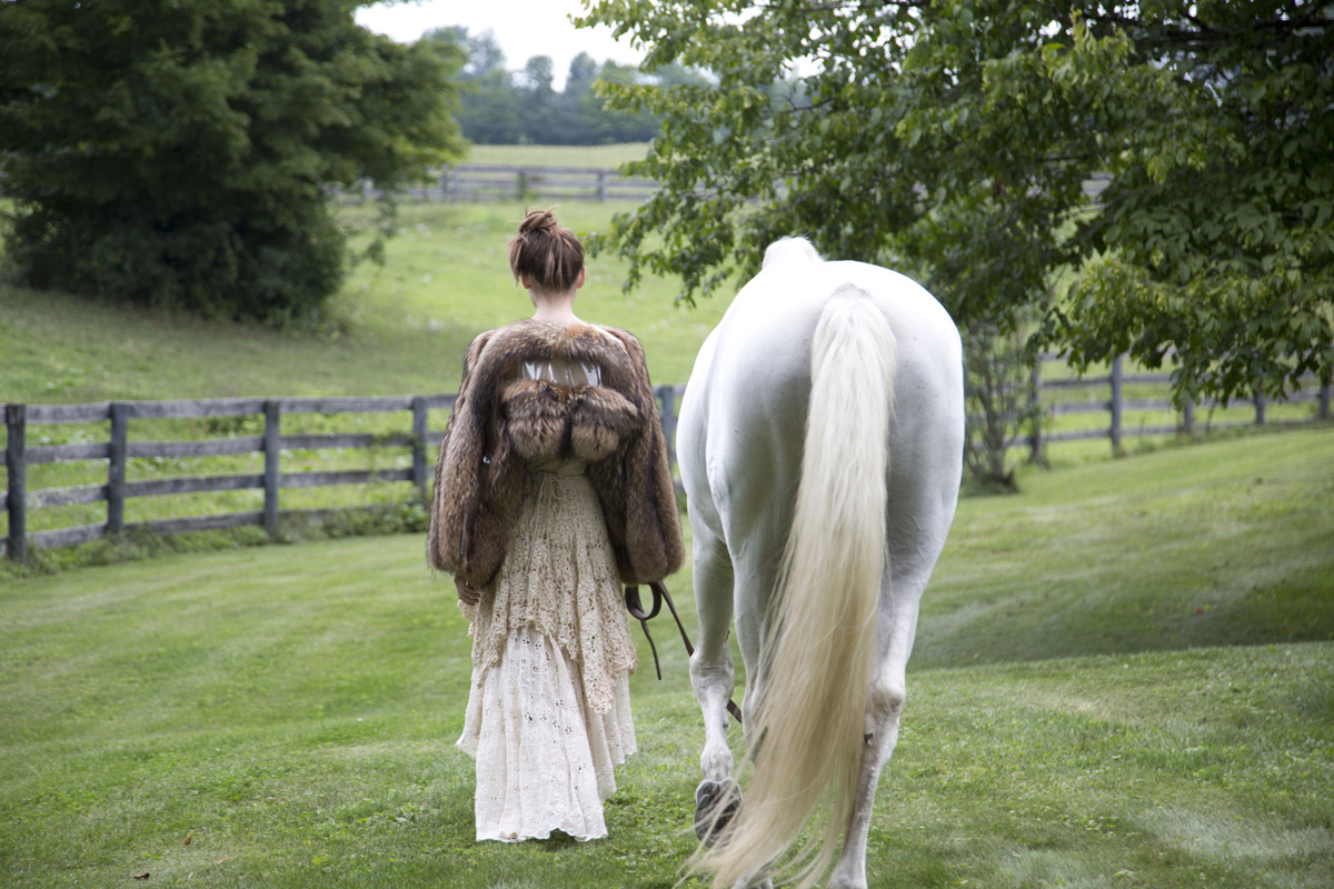 The model is also wearing a double lace skirt. Skirts are repurposed hand made vintage lace. Almost discarded, this treasure of old crocheted materials were a rich and beautiful textile for yet another circular fashion challenge.