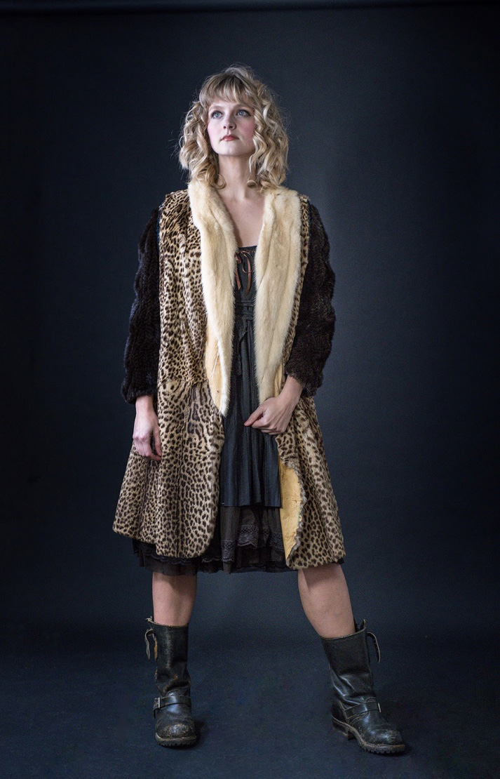 This combo is two pieces that can be worn in multiple ways. As a result of the article in Wag Magazine, I was contacted by a woman who liked my flipping fur objective. The leopard coat was donated as a result. It had been made by her grandmother who was a tailor and worn by both she and her mother. Her story linked to mine.