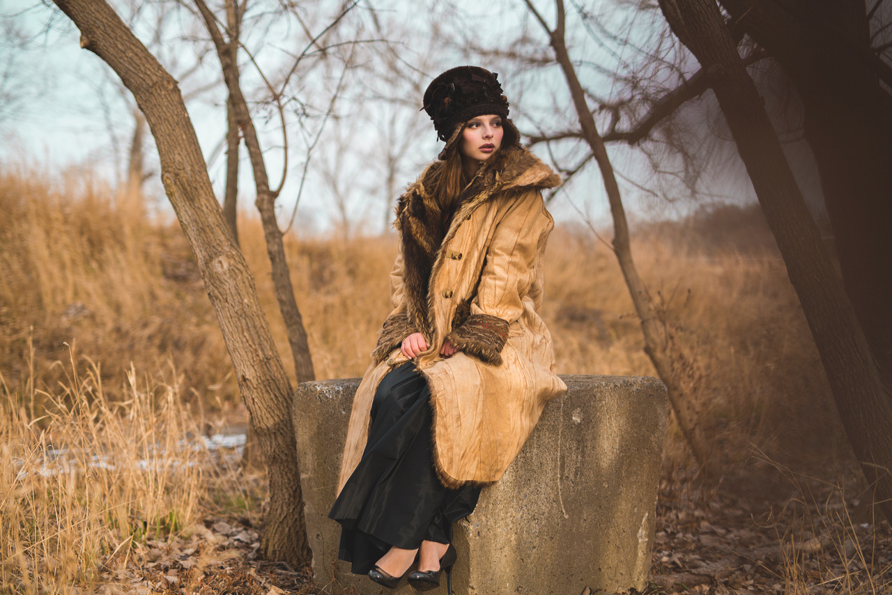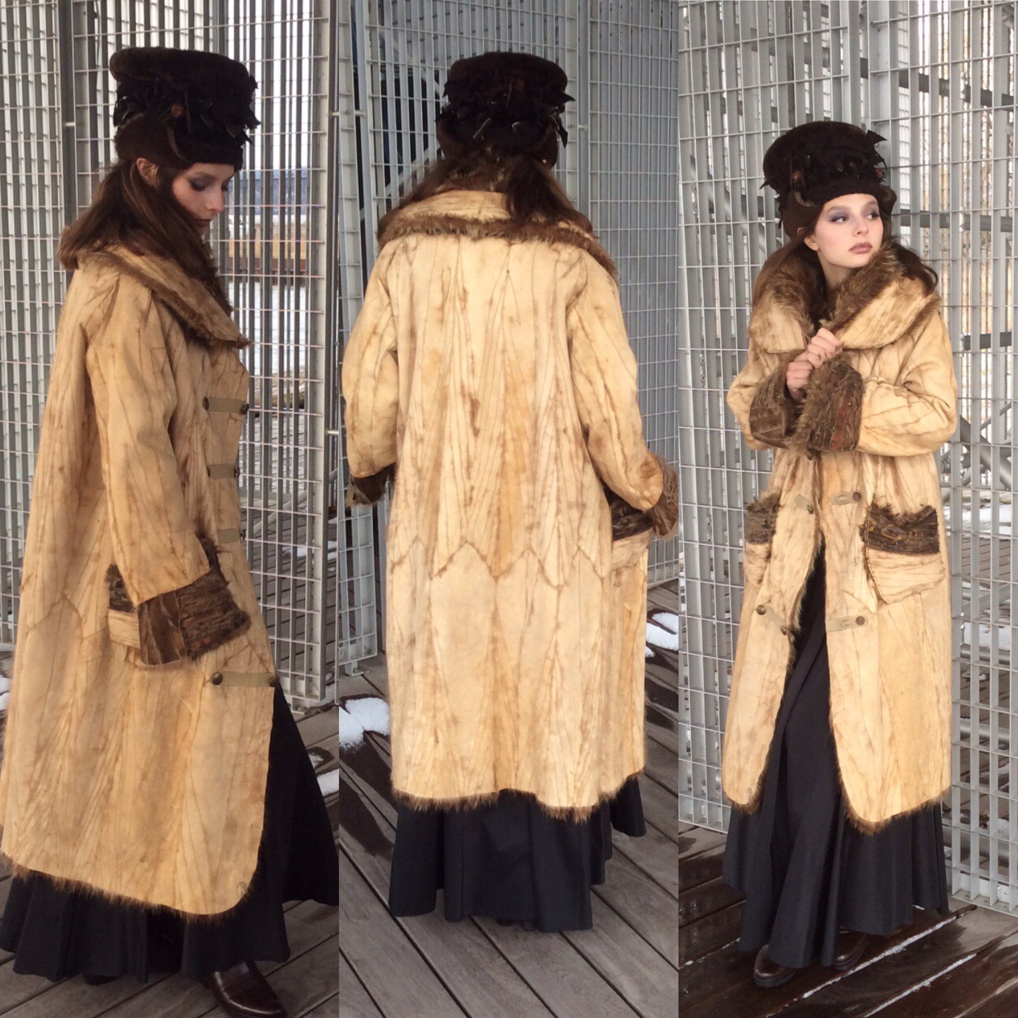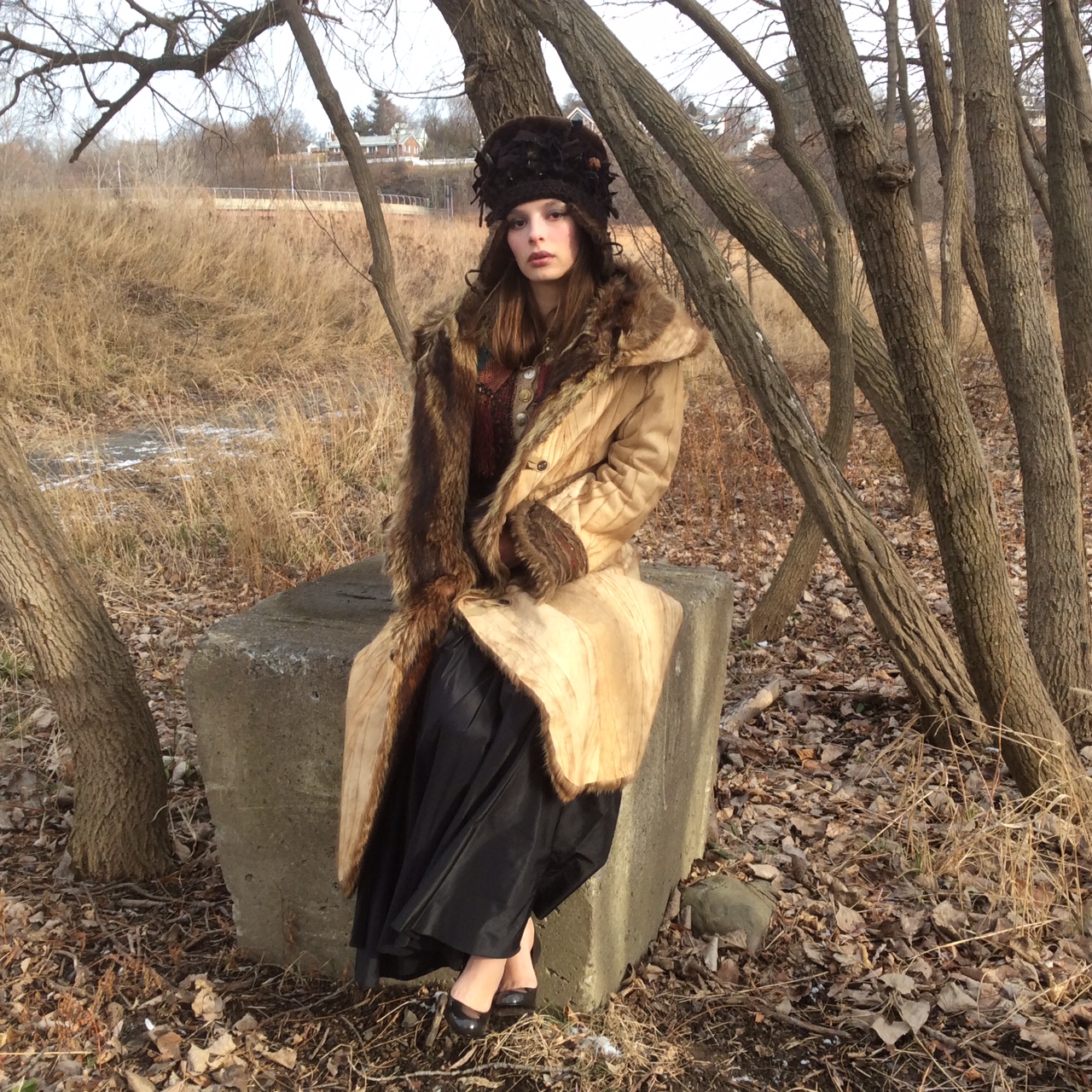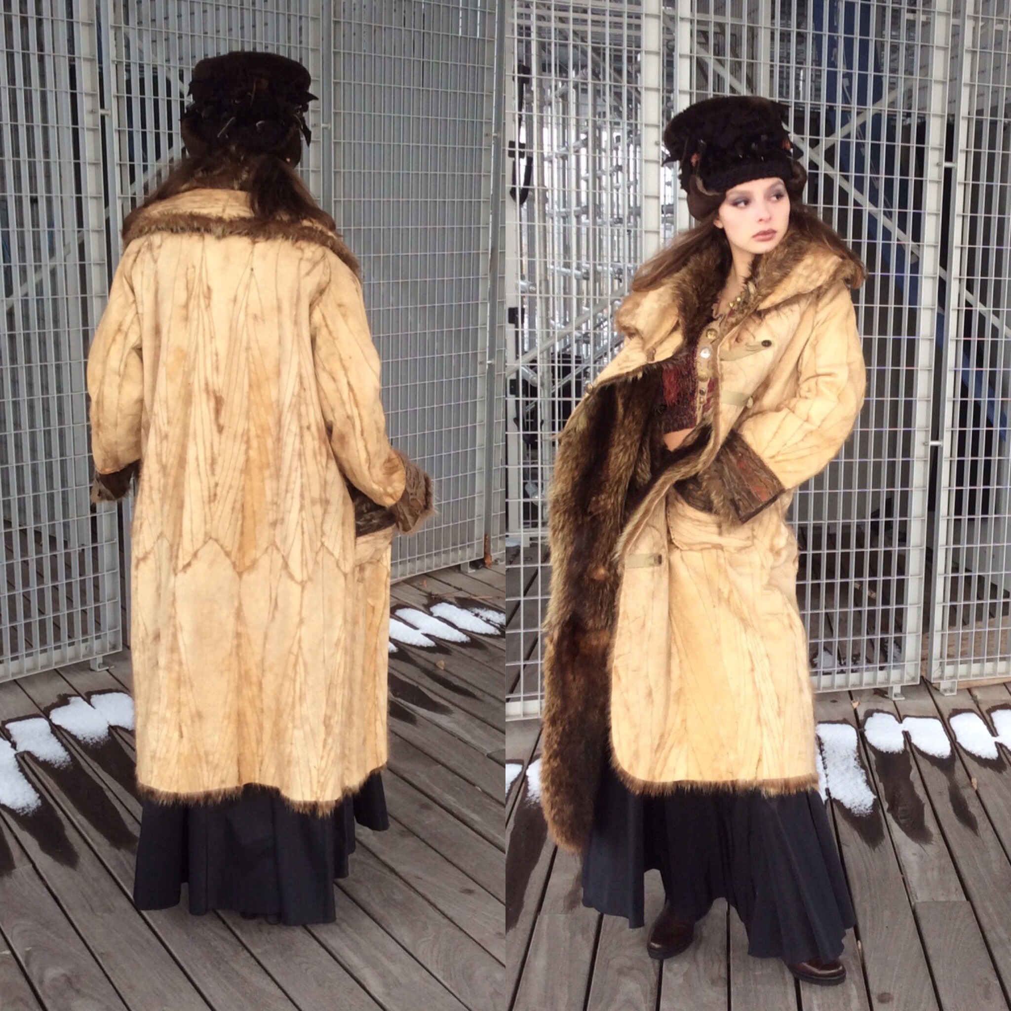 The costume designer, John Glaser, provided me with 2 raccoon coats to flip in order to create a coat for The Penguin in the TV series Gotham. Here, both hat and coat work as well on a female.