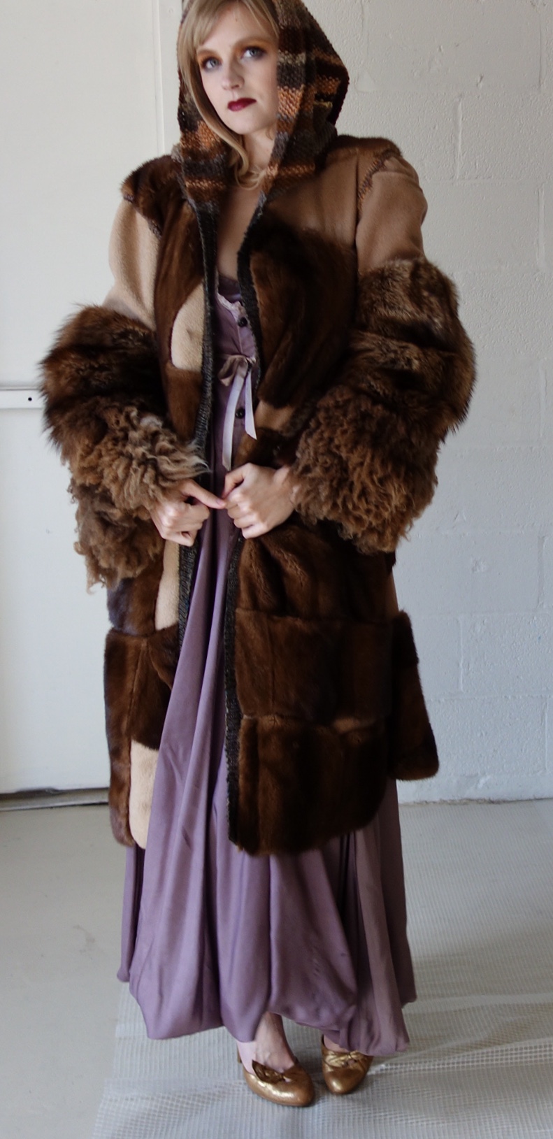 In 2018, another e-mail resulted from the September issue of Wag Magazine. Sonia had a Fendi mink from the 1980’s that was in terrible condition. I advised her against a redesign and a save. She insisted, so I mentioned that it would be necessary to cut it up into many pieces and create something wild. I combined her salvaged pieces of mink with sable, lamb, fox and boiled wool coating. I designed the hood, which was knit according to a sketch. It resulted in a flipping fur design using the pieces from the Fendi. It is also reversible.