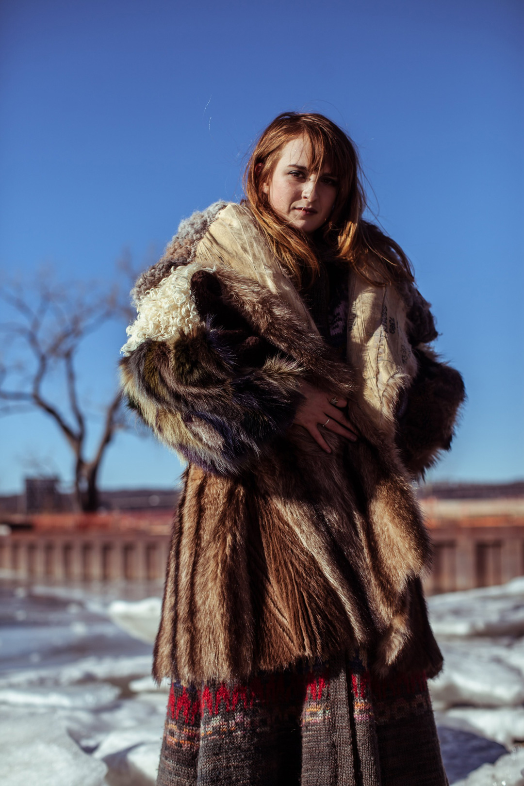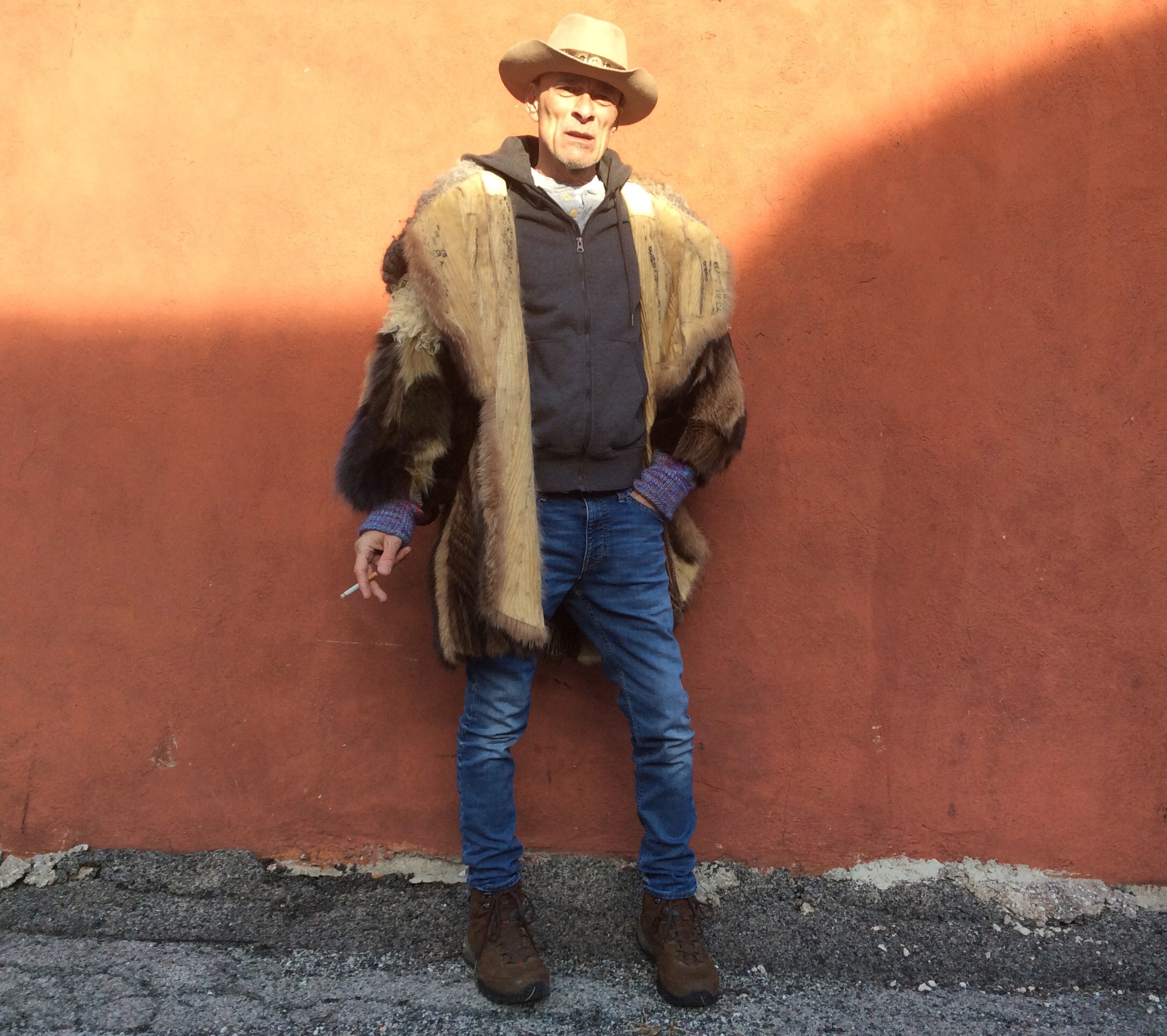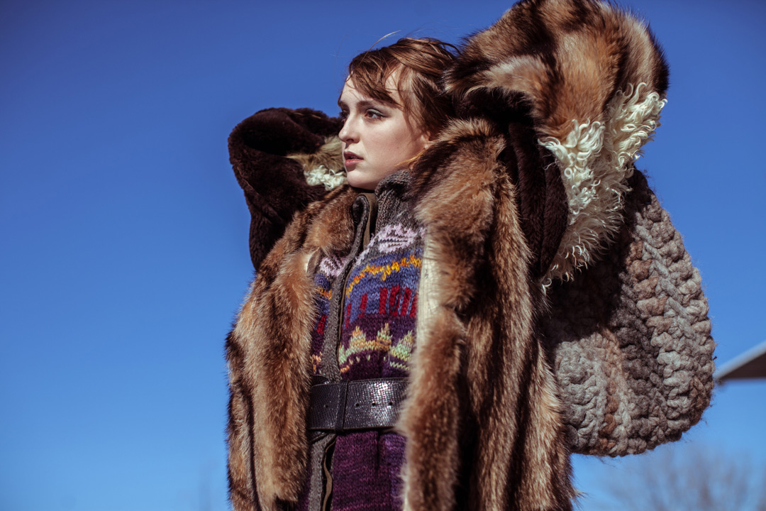 Naomi presented me with two furs that were in very poor condition. I had a considerable amount of scraps left from recent commissions. This was to be a puzzle coat and a freedom of design coat. The hood is crocheted alpaca roving. The cuffs are knit with alpaca. The alpaca was acquired from a local farm. The coat is rustic, rich in character and reversible.