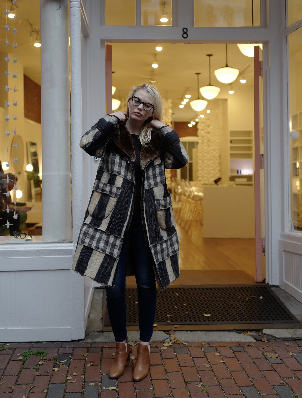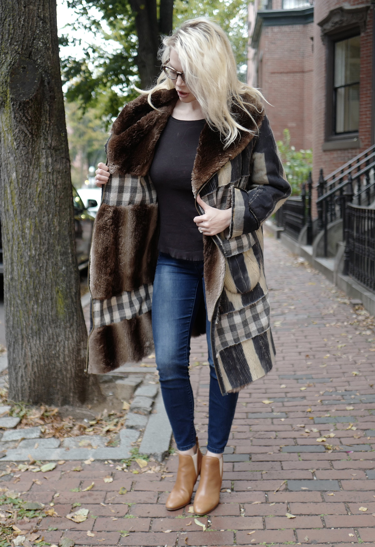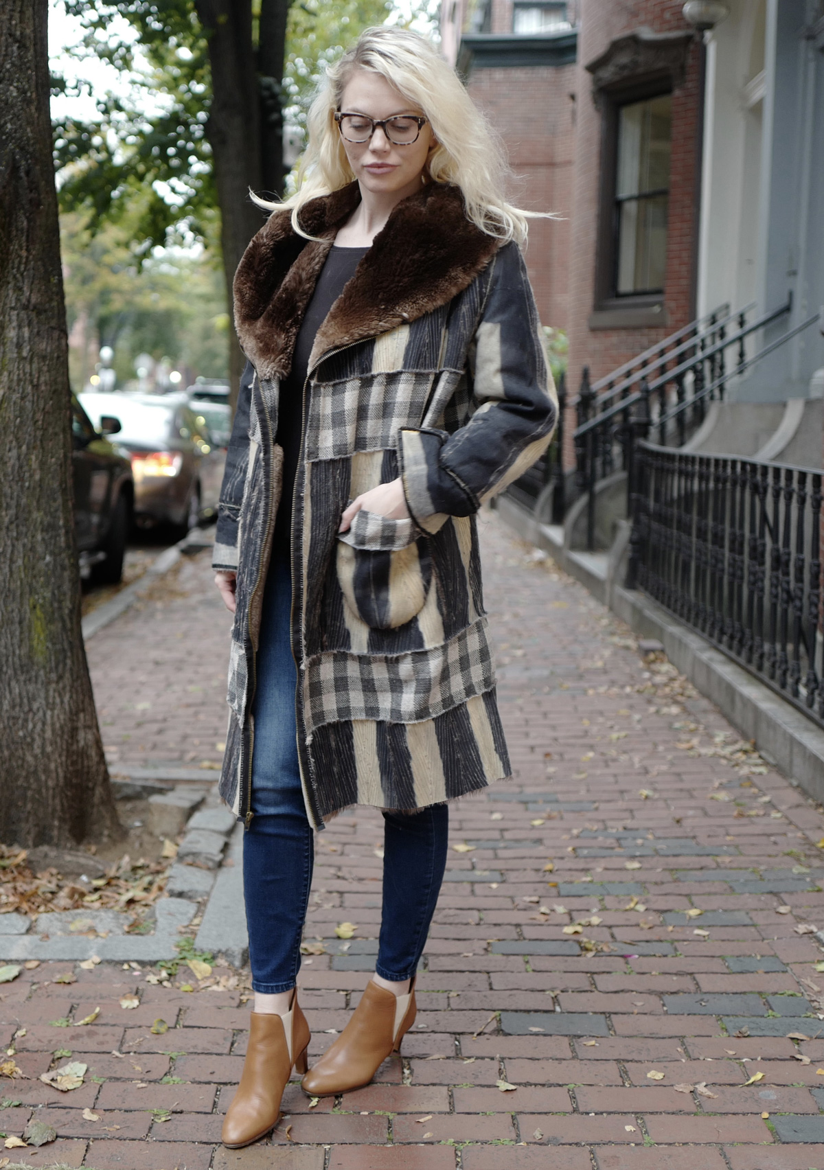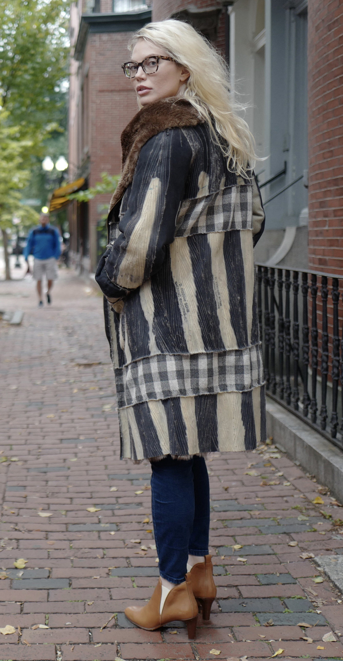This was one of my favorite design transformations. Another Maine thrift shop find, sent to me by a friend. The signature inserted strips were hand-woven and made to order. I chose the yarn, the weave and the size of the strip to coordinate with the stripes made by the dye on the flip side of the fur. The pockets and zipper details made it a favorite piece. At my first pop-up, a man tried it on and bought it. Like many of my coats, they work well for anyone who fits the unique style of a particular Flipping Fur piece.
