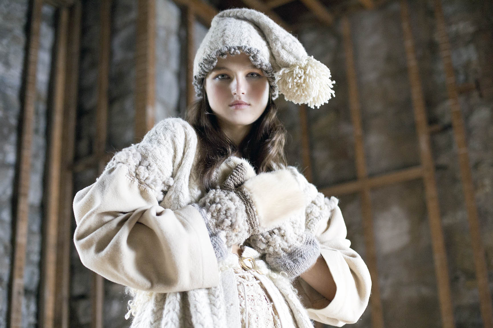A deconstructed alpaca sweater and a pair of cashmere sleeves, from reworking a jacket, were combined to create a more interesting design. This further inspired the hat, the gloves, the belt ( New York Textile Labs ) and even the shoes.