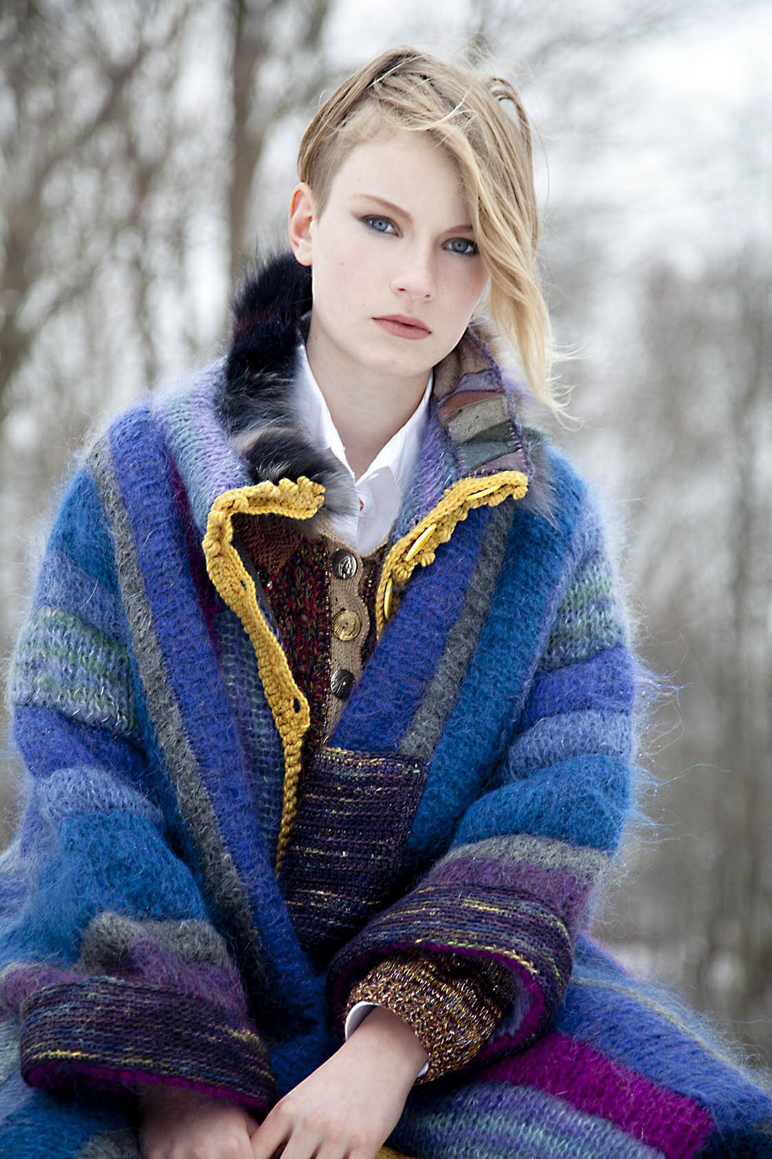 A 1970’s mohair duster redesign. A large hem was taken up and a fleece lining added. A new pocket, cuffs and a yellow border were crocheted. Hand made buttons and a fur collar were the details that completed this design.